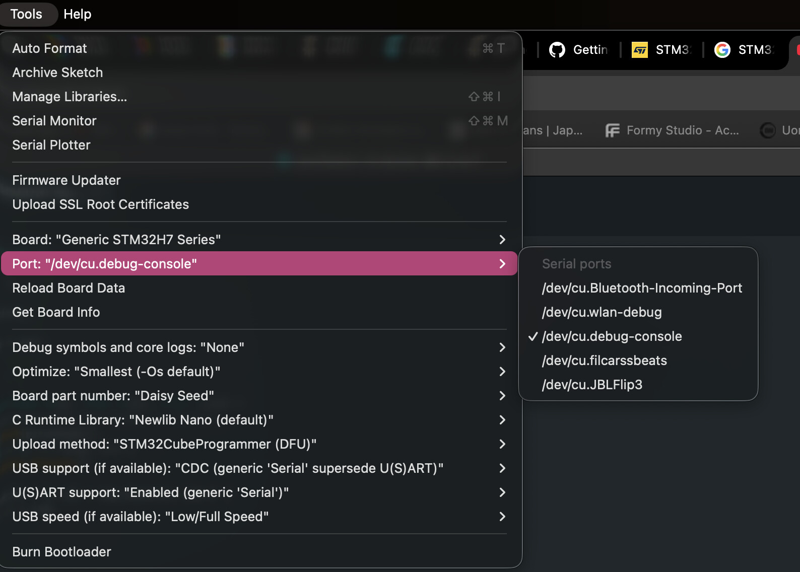 All the necessary libraries are installed (daisyduino, u8g2, stm32 mcu-based boards), and the tools configuration should be correct.