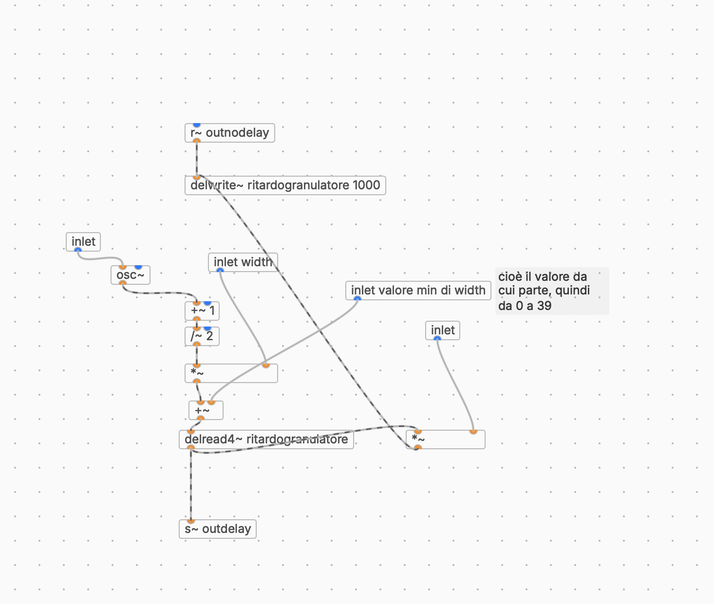 If I connect a potentiometer to the first inlet, I have no problems. However, if I connect one to the second inlet (inlet width), I hear nothing. If I connect a potentiometer to the last inlet (which adjusts the feedback), I hear audio, but other controllers that adjust parameters of the main patch no longer work.