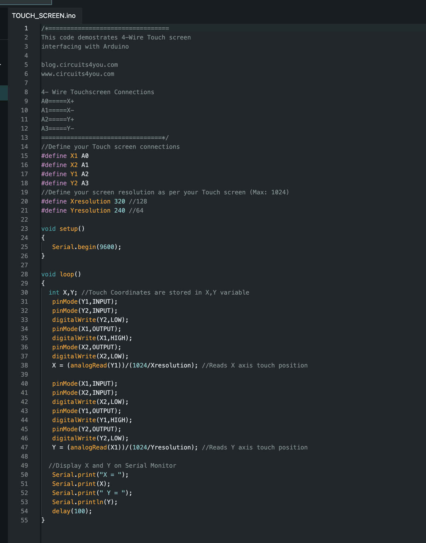 The problem is that all four wires are analog pins; the microcontroller must change their function during the coordinate measurement process. To measure the X coordinates, the microcontroller would set X+ and X- as digital outputs (5V on X+ and GND on X-) and measure the voltage on Y+ and Y- using analog inputs.
