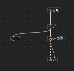 [notein - Left outlet] → [mtof] → [osc~ 440] → [dac~]