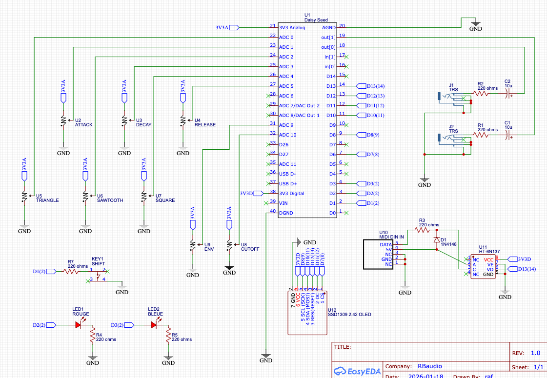 Hi guys, here’s my PCB circuit schematic using the Daisy Seed. It’s a small synth with a stereo output (2× TRS, this is intentional). I’d really appreciate your feedback and advice. If you have any suggestions or improvements regarding the wiring, they’re very welcome! Thanks in advance.