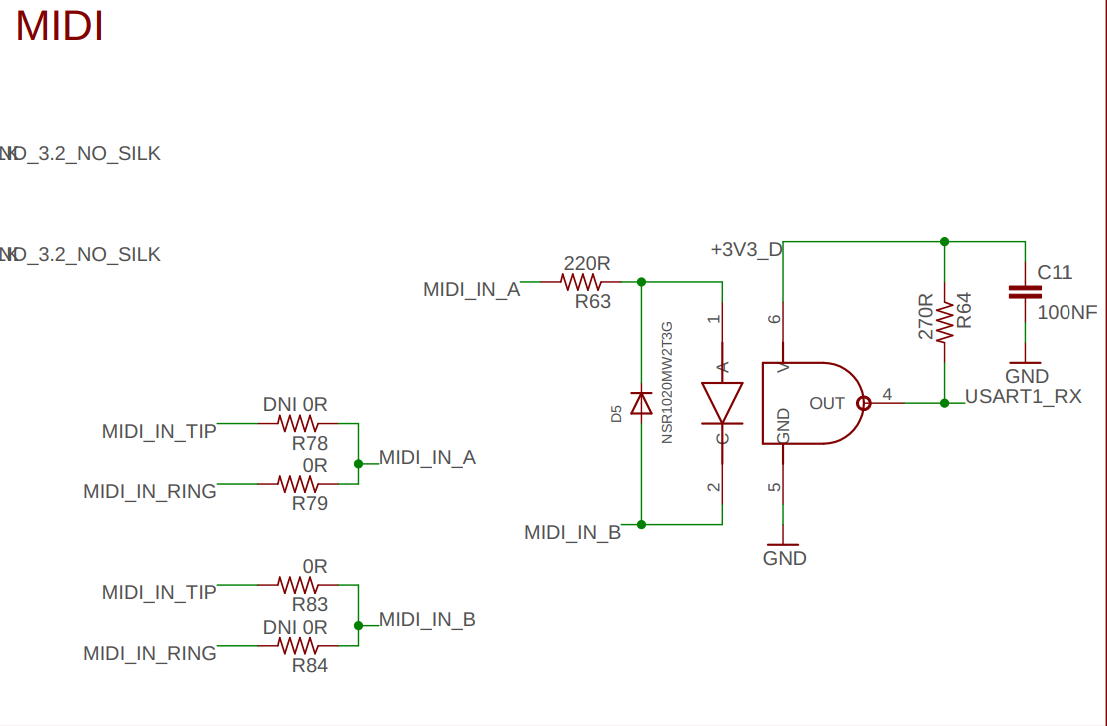 What I meant earlier is that on the Pod schematic, MIDI A and B or both missing a connection. With the DNI 0R, there’s only one path shown for each. Because MIDI requires two signal connections plus ground, it looks like the second signal for MIDI A is effectively the net labeled MIDI B on the schematic.