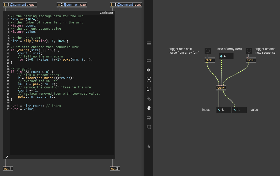 I found this nice example of making urn in gen by Graham Wakefield and tried to modify it to output value and index pairs. I want to use it in conjunction with poke to populate data from which I could just read in a loop using peek and counter.