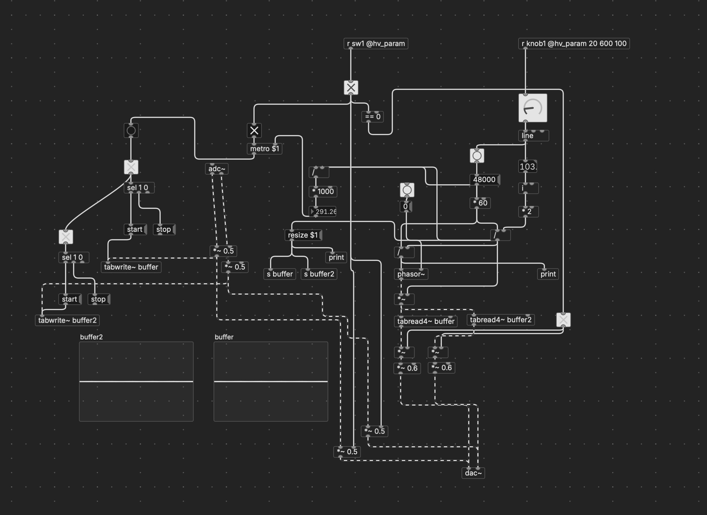 I have a looping patch I made that Im trying to get to work on my daisy seed. The basic concept is that when the main tgl is engaged the looper is bypassed so the audio flows freely to the dac~ while the stereo buffers are constantly writing and erasing audio to the arrays. The speed at which they are writing and erasing is correlated to be an 1/8 at a specific user-set bpm. Then when the main tgl is switched the loops is engaged and loops the last 1/8th note of audio written to the arrays.